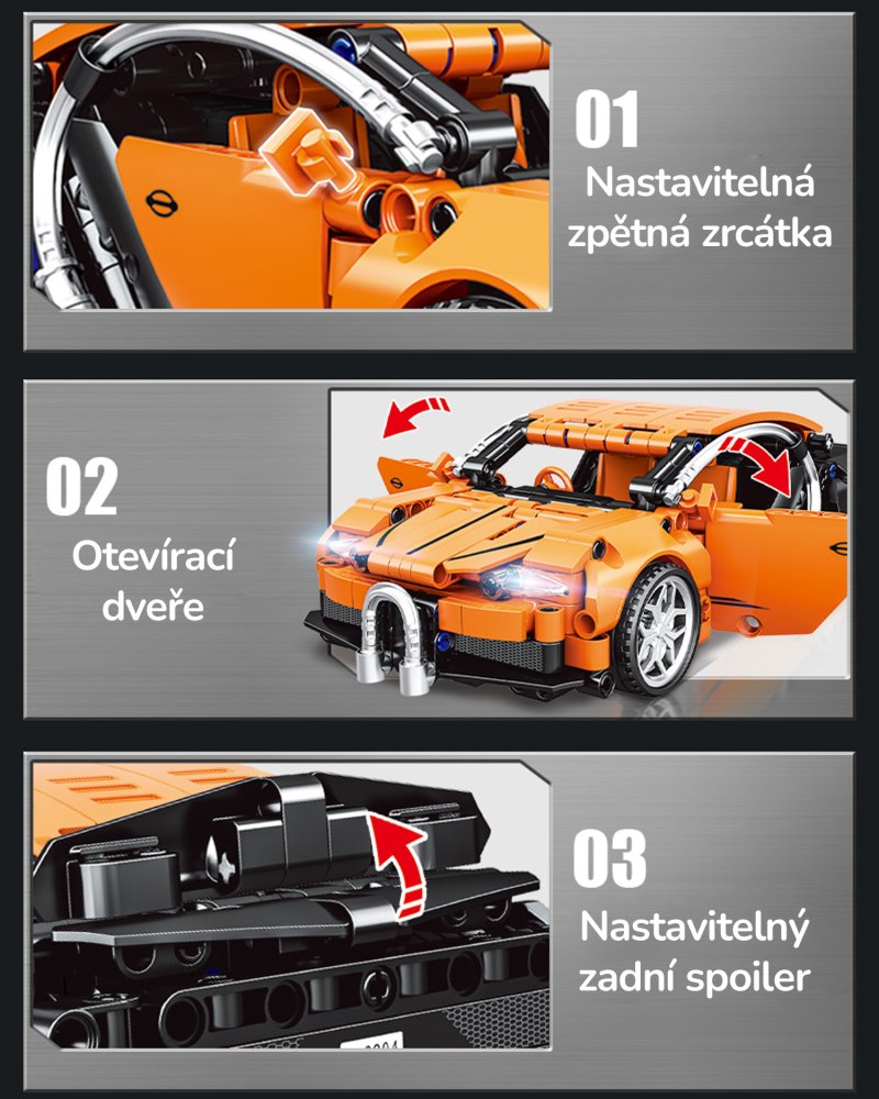 Комплект за състезателна кола с 391 части. Разполага с издърпващ се мотор и отварящ се багажник. Детайлен 25-сантиметров модел за деца и възрастни автомобилни ентусиасти