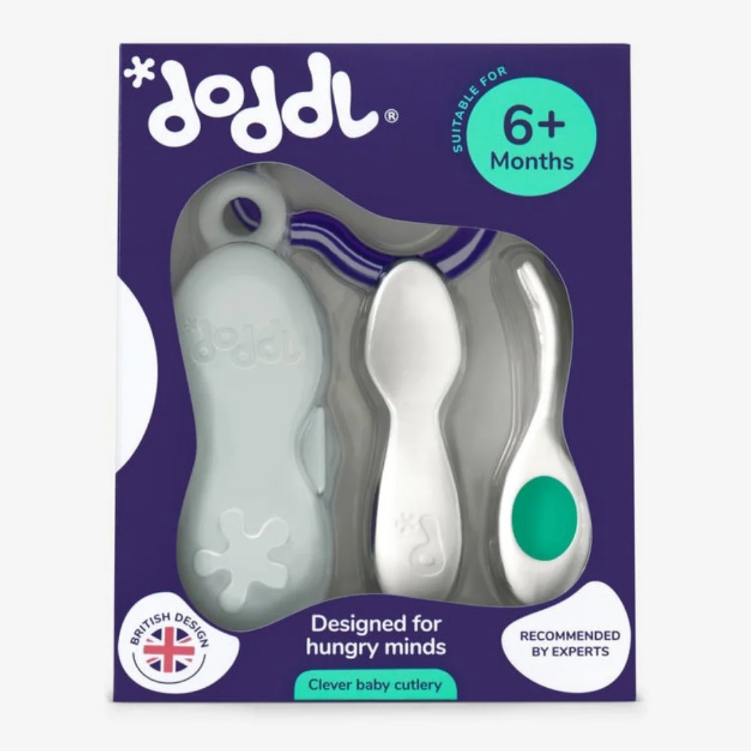 Комплект прибори за хранене бебе doddl , подходящи от 6м+.. Иновативен сет от вилица и лъжица с къса ергономична гумирана дръжка , която има за цел да развие фината моторика на детенцето и така по-лесно да премине от хватателен към пинсетен захват. Ключово умение , което е изключително важно за последващото развитие на детето. Ваш верен помощник, ако практикувате ЗВБ – захранване водено от бебето. Лесен преход към приборите за „големи“ 🙂 Doddl са сертифицирани като безопасни за малките, могат да се поддържат, дори в миялна машина и са препоръчани от редица експерти. Без Бисфенол А (BPA) и вталати , приборите за хранене са абсолютно безвредни. Английски дизайн с множество награди. Истинско удоволствие за всеки родител е да гледа как малкото му детенце се храни самостоятелно и уверено с doddl приборите.