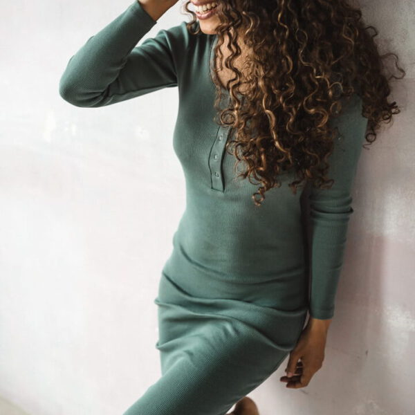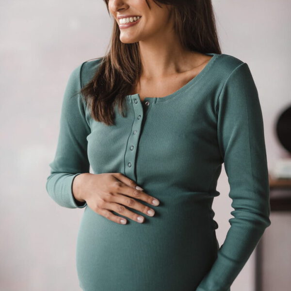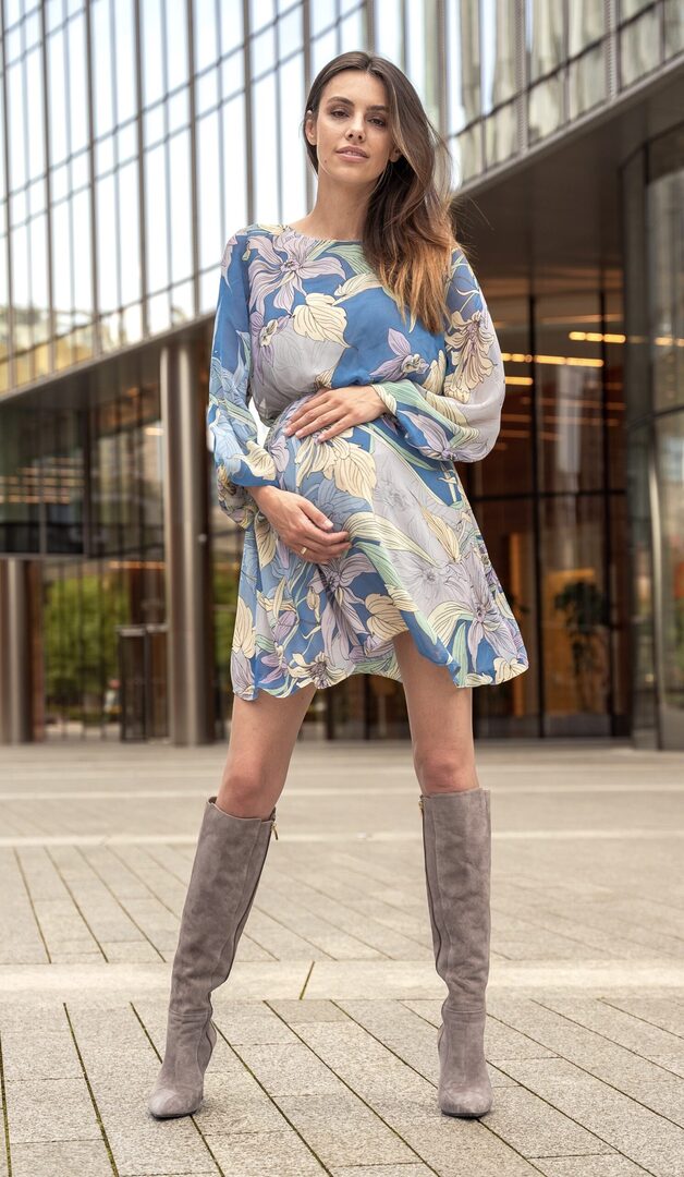 Грациозният, момичешки модел TAMARA радва с флорален принт на тъмносин фон. Тази копринена рокля е с разкроена долна част, която ще прибере растящото коремче, цялата е прибрана под бюста с пришит ластик, а дългите ръкави са завършени по подобен начин. Този модел е създаден като допълнение към палтото MAYA и якето DIANE, върви чудесно с тях. Можете да го носите и след раждането на вашето мъниче. Роклята стои много добре леко прибрана в талията, което ще скъси дължината й.