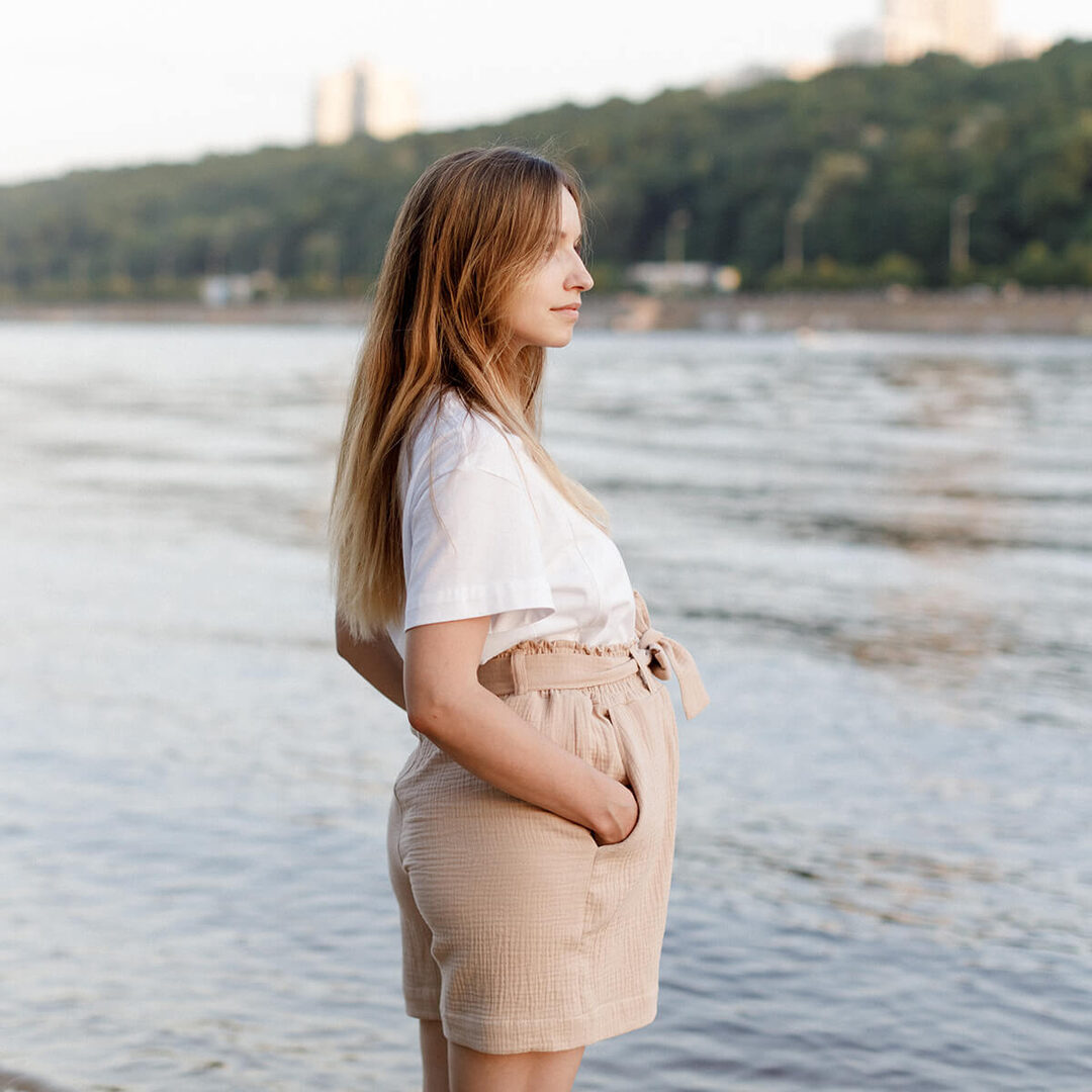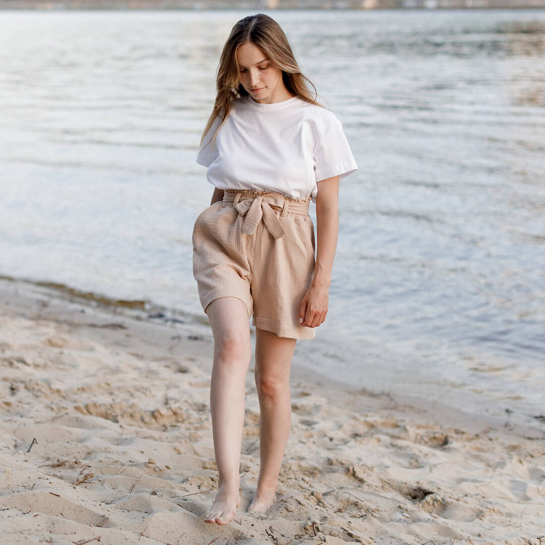 Ефирни къси панталонки / шорти за бременни с декоративен колан и силно еластична и мека горна част.