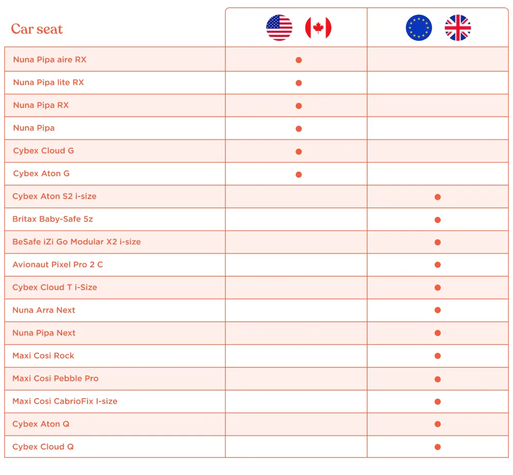 Адаптерите за Метро 3 са съвместими с редица кошчета за кола Cybex, Maxi-Cosi, Avionaut, BeSafe und Britax и др.