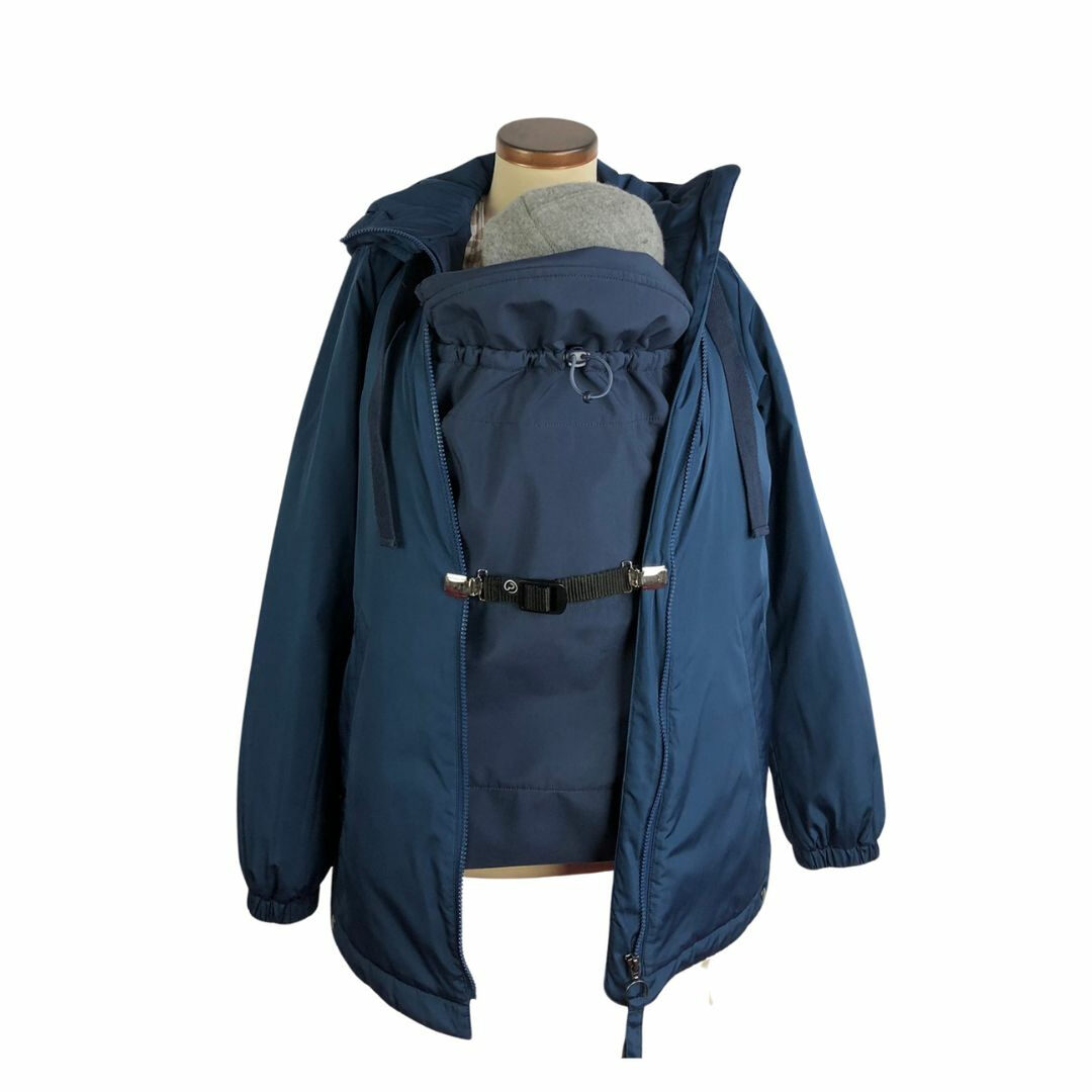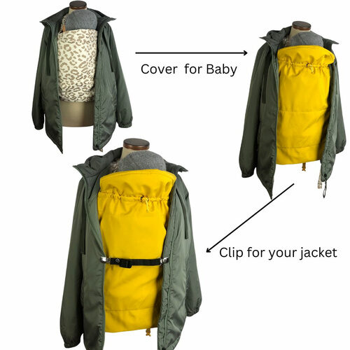 Основна специфика , когато носим с покривало за бебеносене е ,че редът на слагане на дрехите е такъв ,че нашето яке на финал остава най-отвън и разкопчано.