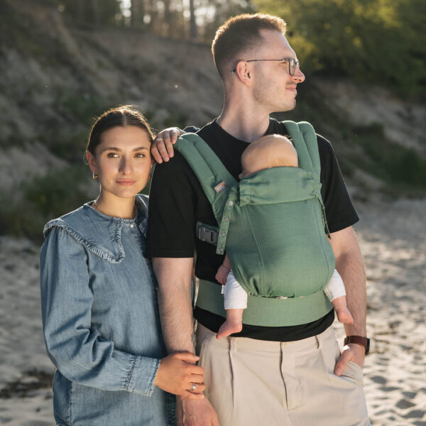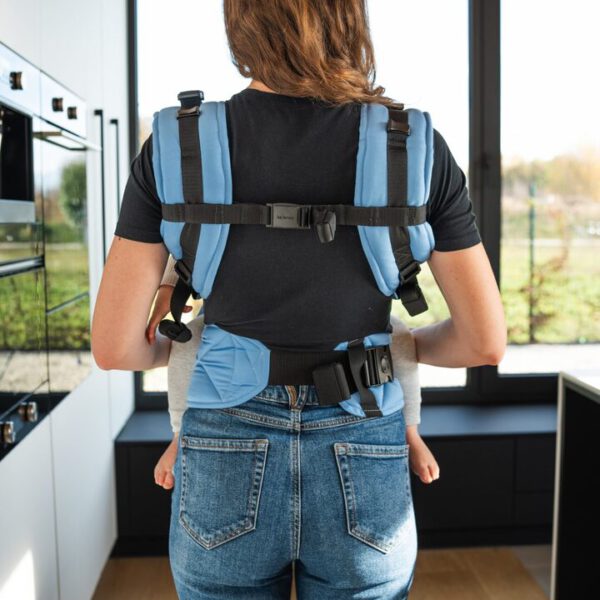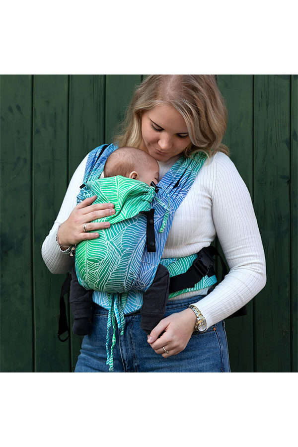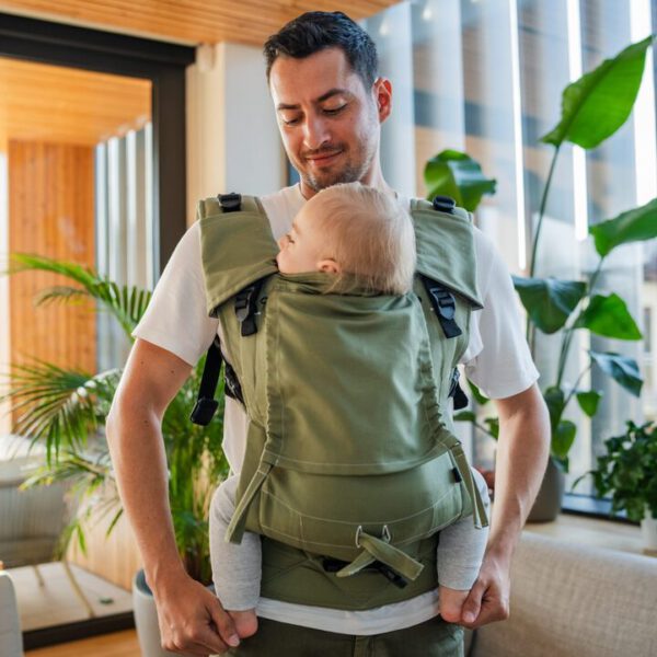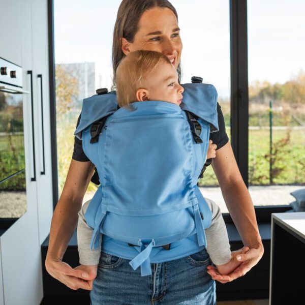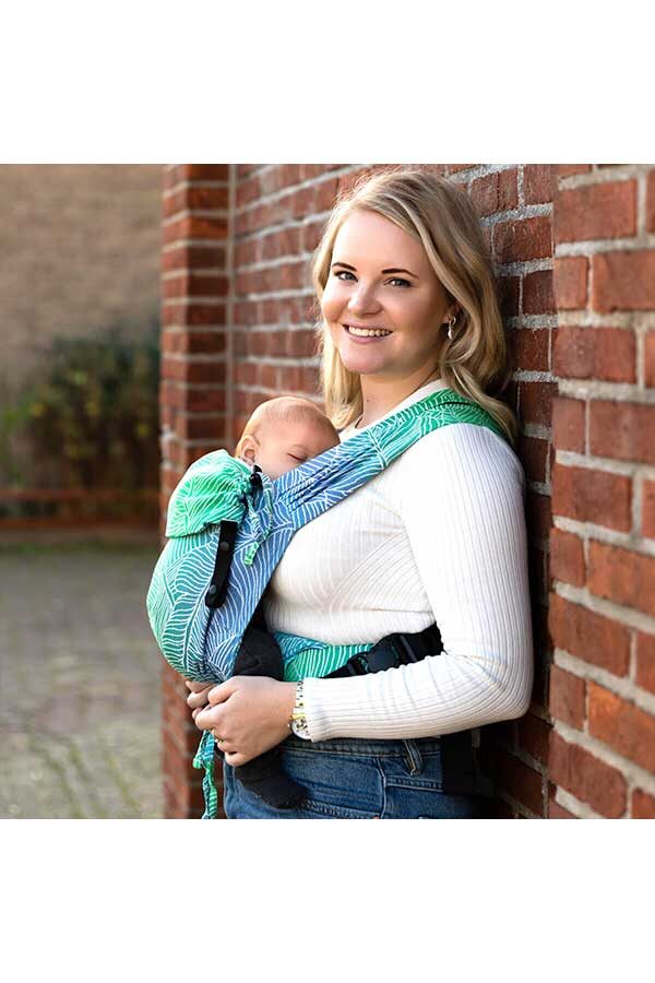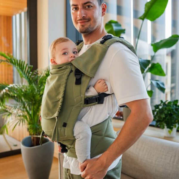 Следващата характеристика, която прави тази хибридна раница любима на много семейства е , че вече няма презрамки – дълги опашки, както при повечето хибриди , а имаме full buckle модел, т.е. презрамка с катарами, както при класическите ергономични раници. Това прави слагането изключително лесно и бързо за всеки. Възможност за регулиране на презрамките, спрямо носещия и маркировки от вътрешната им страна , за да не губите време всеки път за нагласяне, когато мама и тате се редуват с носенето и си сменят раничката. Регулираща се качулка за бебчето и „яка“ , с която може да направи хубава опора при малките бебета , които още нямат контрол върху главичката. Специалната конструкция на платката спомага за разпределяне тежестта равномерно и правилно върху цялото тяло на детето, без да натоварва мускулатурата му. Тъкана слингова материя от 100%био памук , която е изключително мека на допир и достатъчно проветрива и в най-топлите дни.