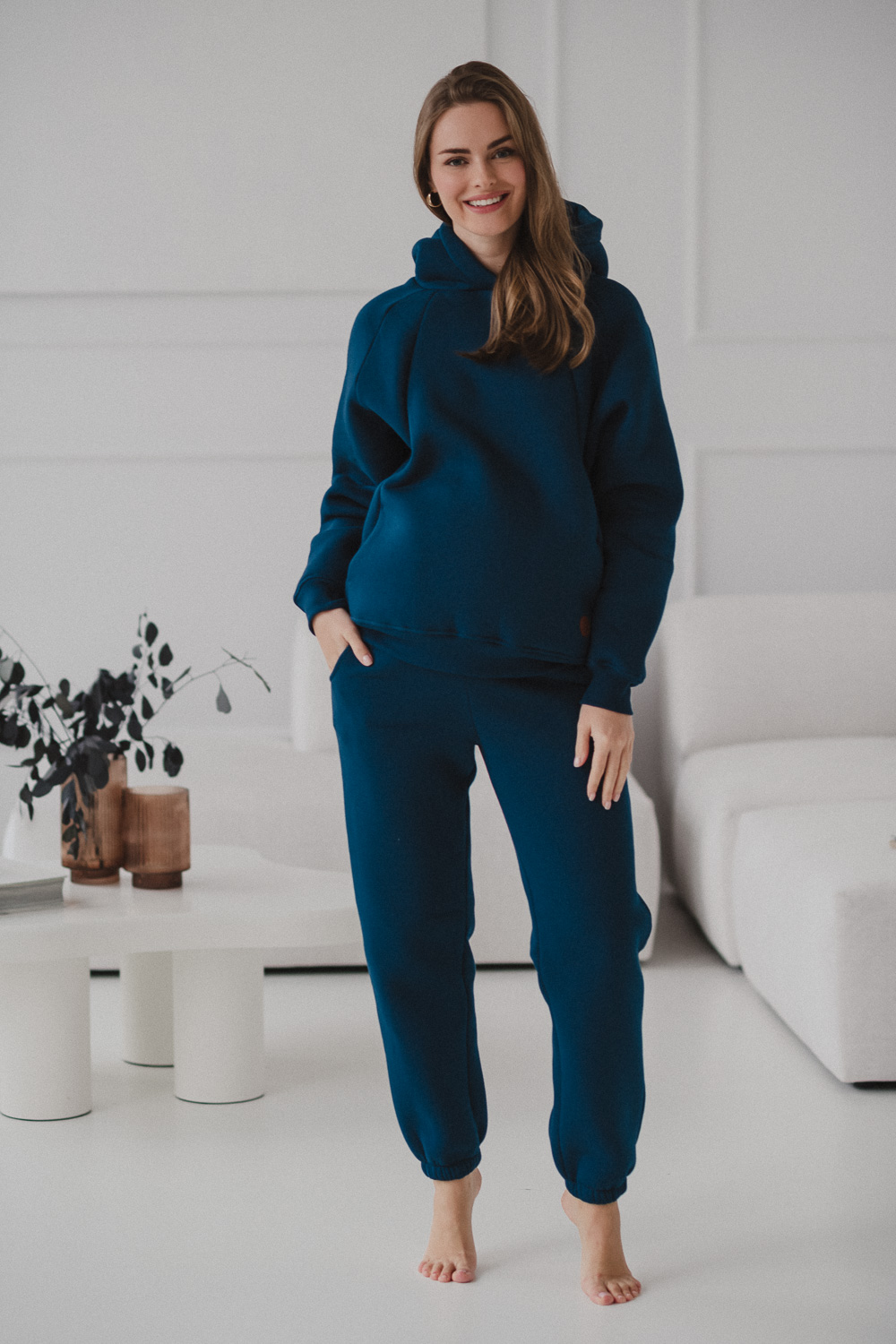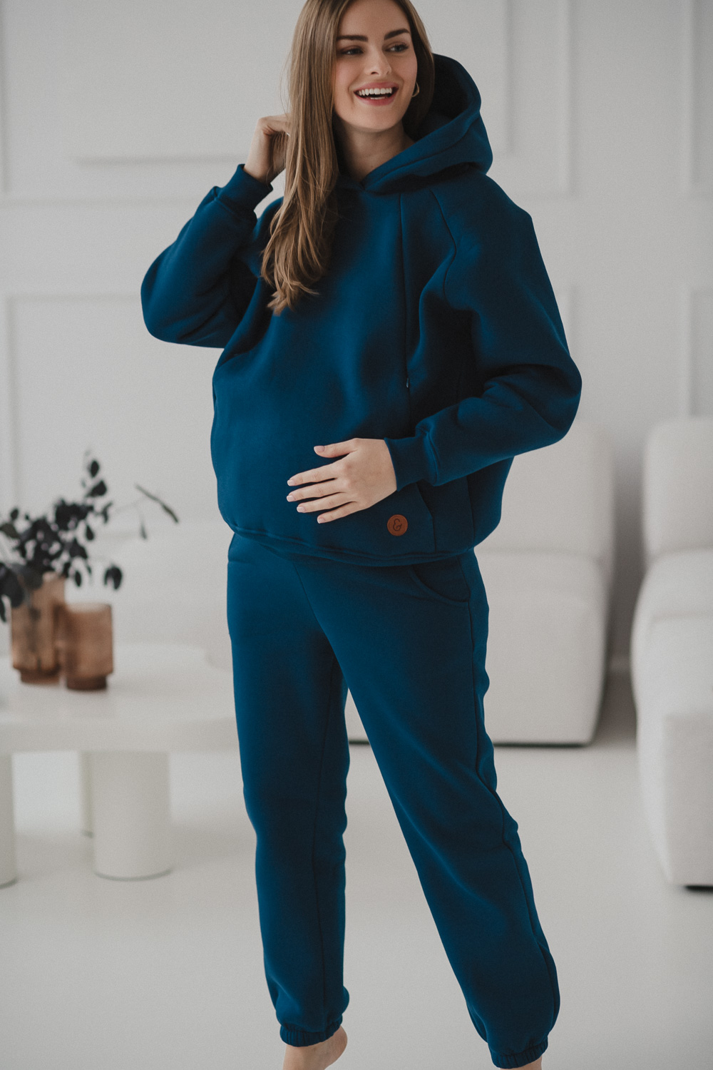 Дебел ватиран спортен панталон, анцуг за бременни с платка за корема морско синьо